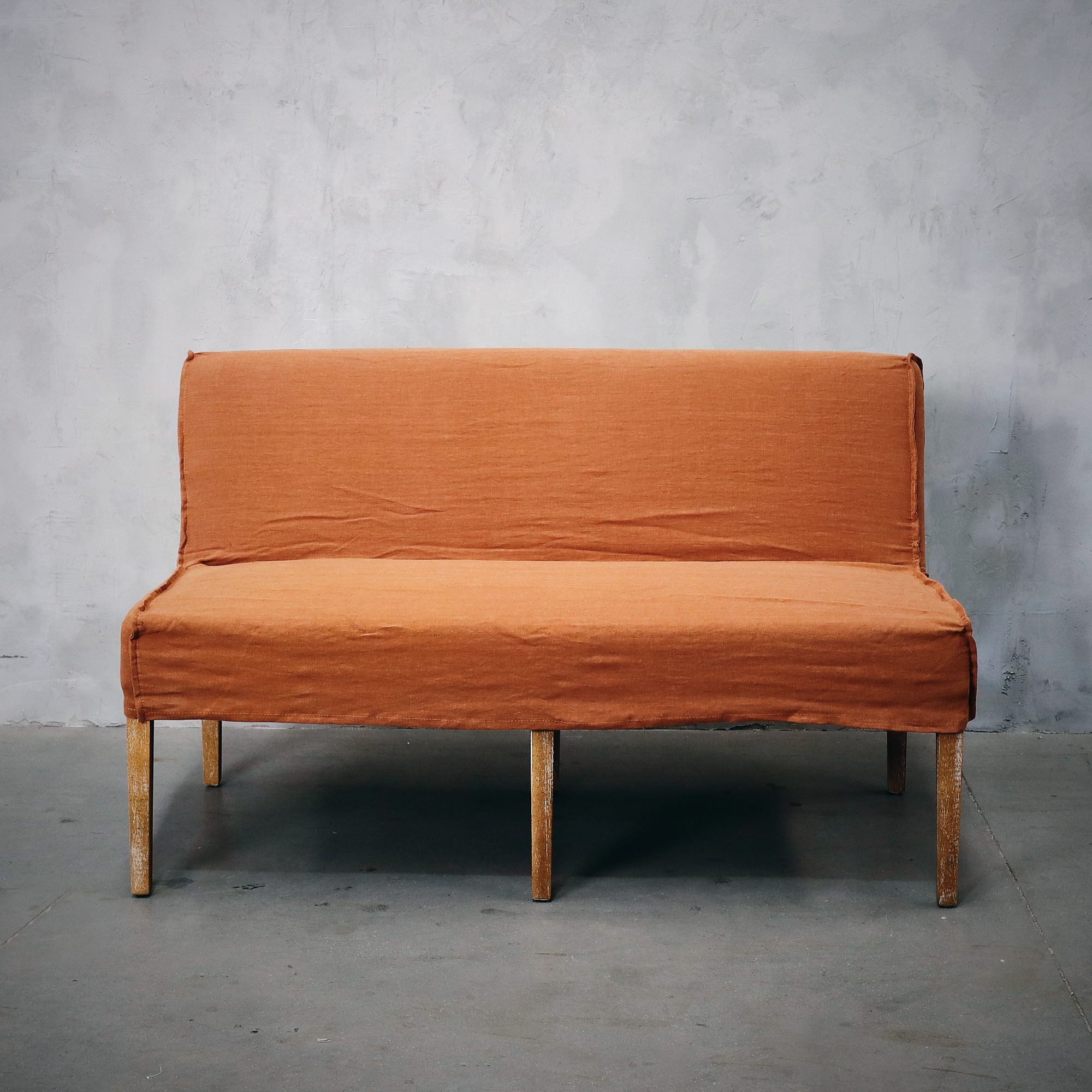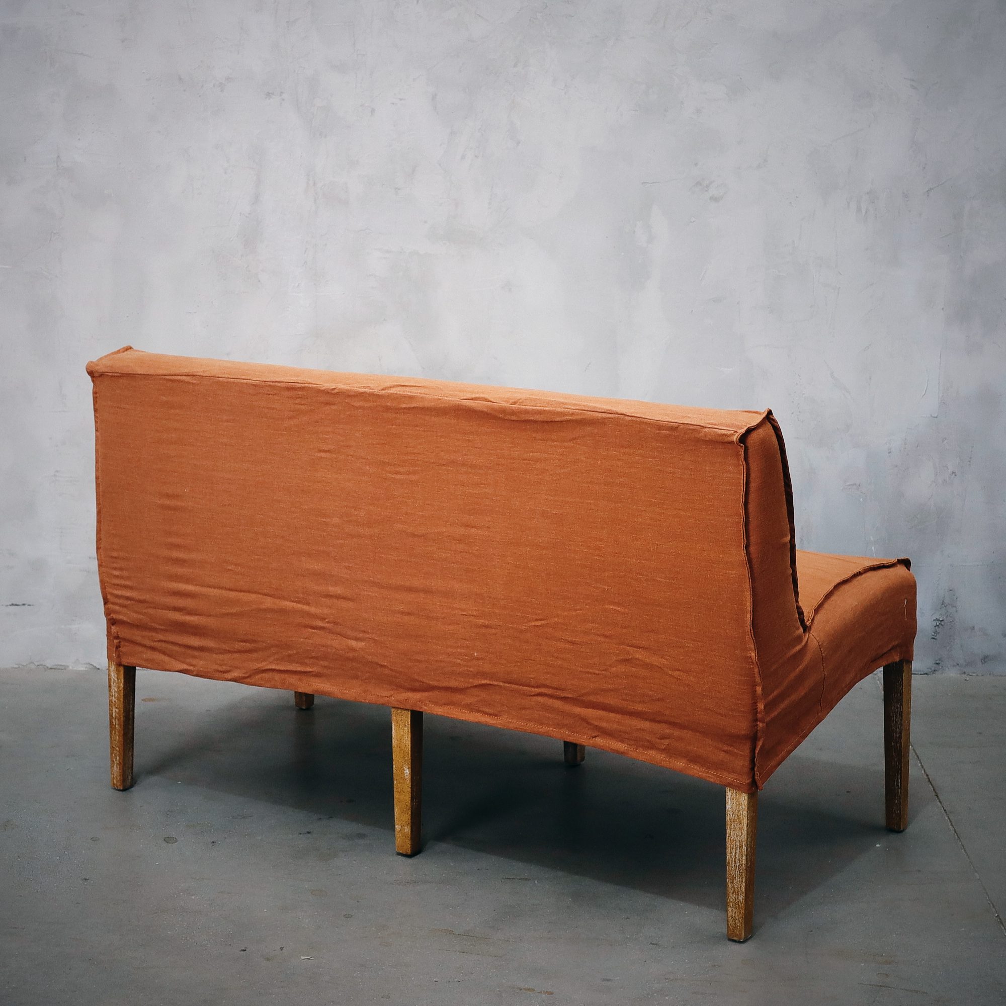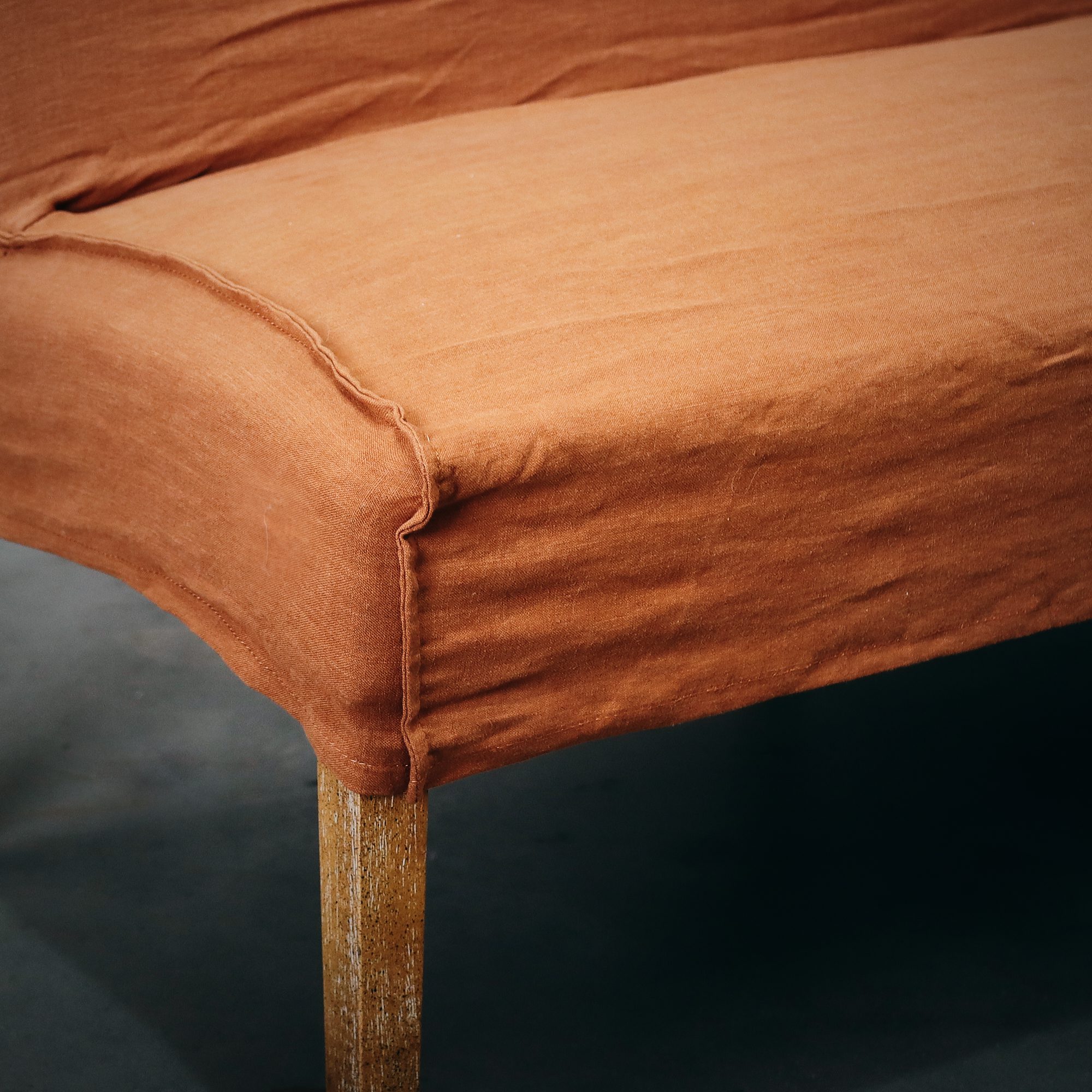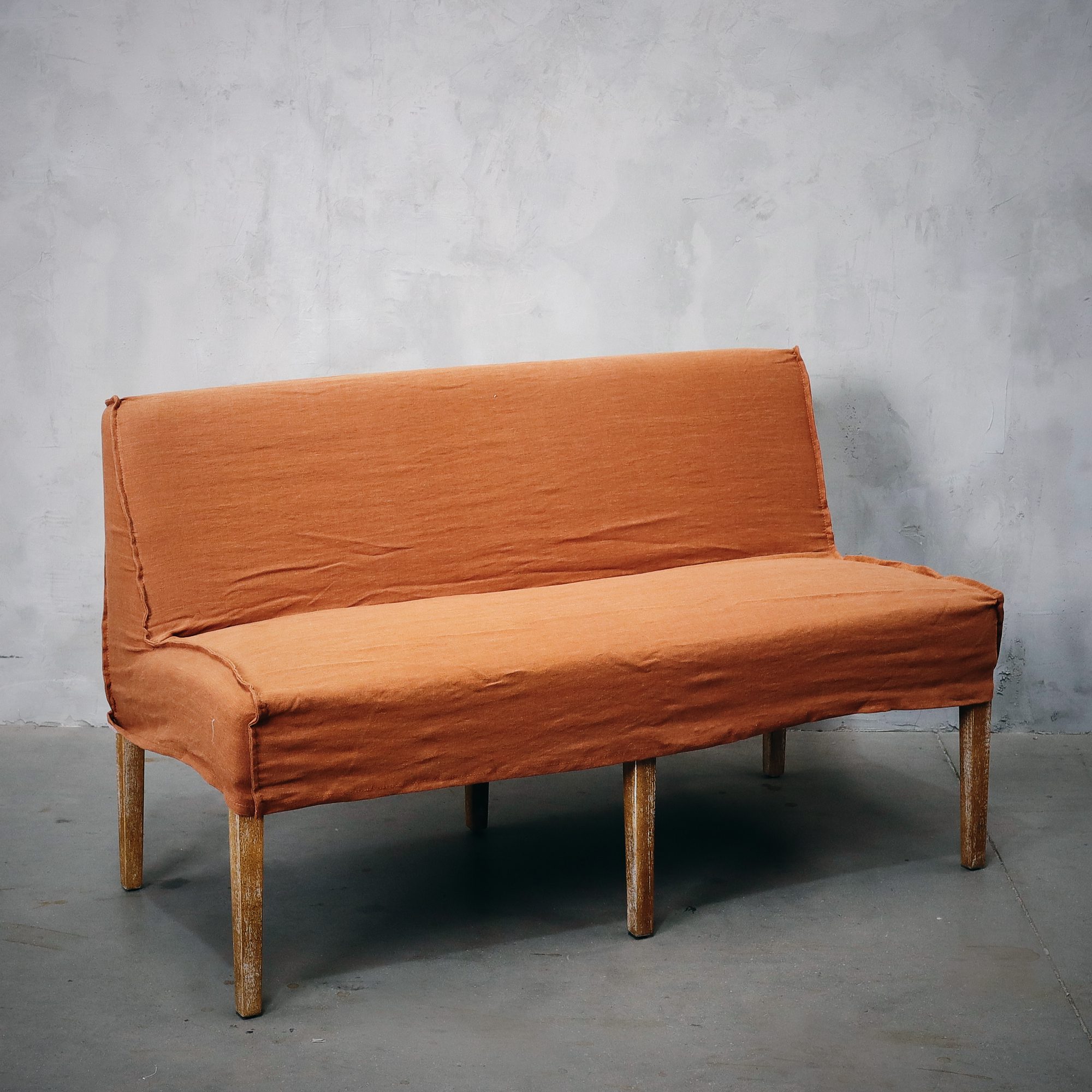 Banqueta de Madera de Gomero con funda de 100% lino terracota.