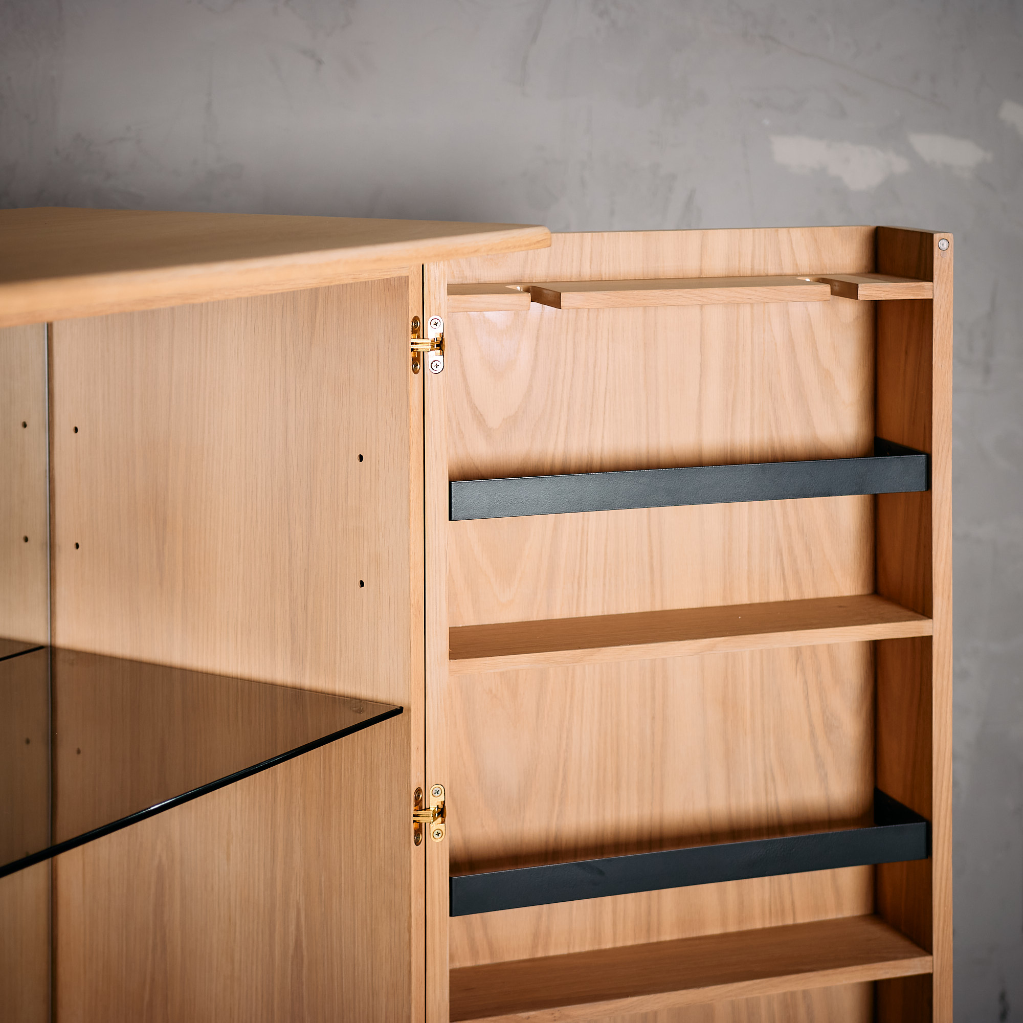 Bar de estilo contemporáneo fabricado en madera de haya con terminación natural, cuenta con estanterías, cajón y vidrio en su interior.