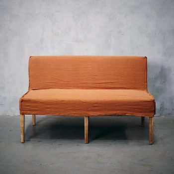 Silla estructurada en madera de roble natural tapizada en tela algodón beige y respaldo enjuncado.